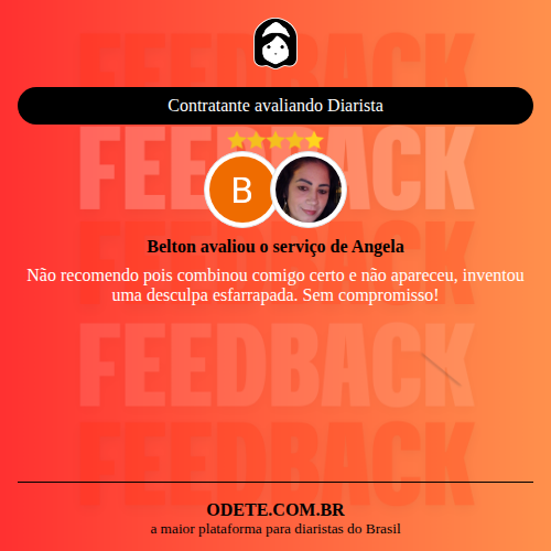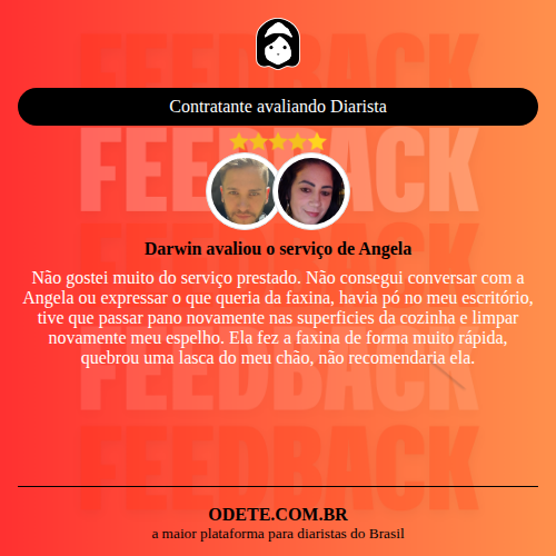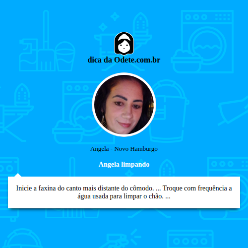Último acesso: 26/10/2025 19:24:11Na Odete desde: 24/08/2020faxinarpassarlavarcozinharorganizarlimpeza residencialvidros e fachadashigienização e impermeabilização de estofadoslimpeza pós-obrapisos e pedras naturaisdetalhamento automotivo