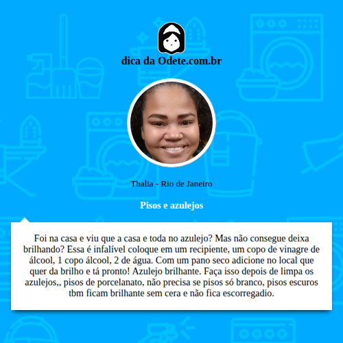 Faça isso depois de limpa os azulejos,, pisos de porcelanato, não precisa se pisos só branco, pisos escuros tbm ficam brilhante sem cera e não fica escorregadio.