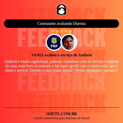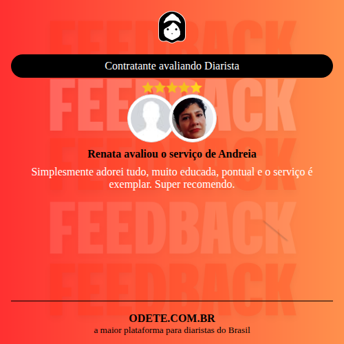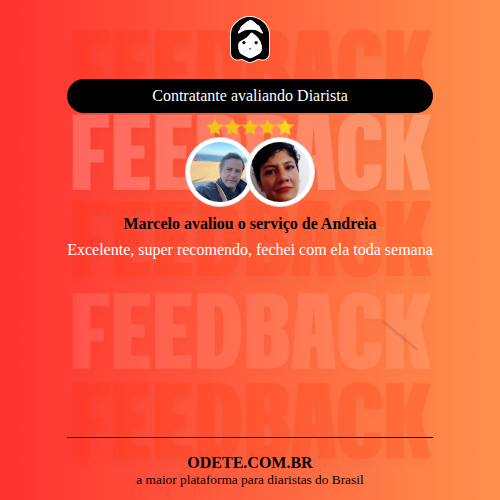 Chegou a contratar Andreia?Que tal avaliar o serviço realizado? Isso vai servir para que outras pessoas confiem ainda mais na hora de realizar a contratação!