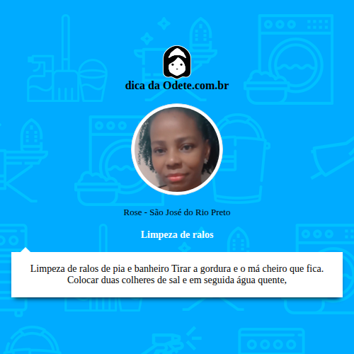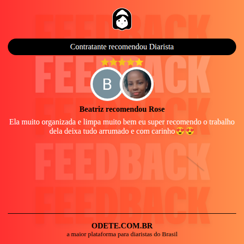 olá meu nome é rose sou faxineira e especialista em organização residencial. sempre acreditei que a limpeza e a organização está associada ao bem está e felicidade de uma família. já tive outros trabalhos em diferentes áreas, mais sempre dei prioridade para a limpeza onde sempre me destaquei . e amo essa profissão por isso fui buscar mais conhecimento e continuo estudando para melhor atender minha, minha missão é encontrar soluções inteligente e funcionais para cada ambiente do seu lar,levando mais praticidade e conforto para seu dia a dia. amo meu trabalho.❣️